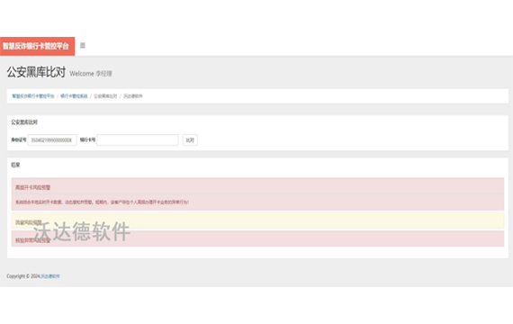银行卡管控系统,主要由网点管理、人员轨迹研判、公安黑库比对、高频开卡风险预警、流窜风险预警、核验异常风险预警组成。