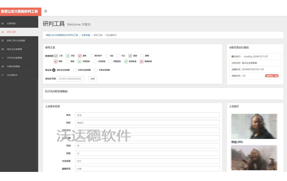 全息档案,根据用户输入的身份证号码、手机号码等,生成个人档案,包括人员基本信息、活动轨迹、关系人信息。全息档案具有信息量丰富、图文并茂、立体全面的特点。全息档案,包括研判工具、研判工具-任务数据、身份证全息画像、手机号全息画像、车辆全息画像。